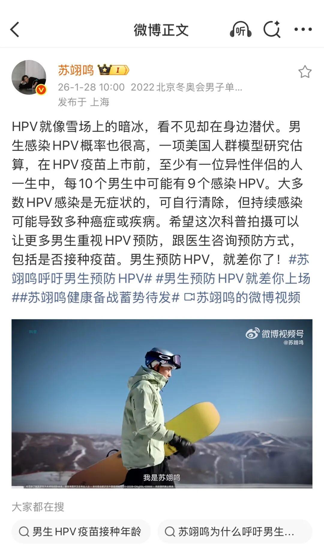 冬奥前夕,默沙东中国借势赛事热度,发布了“呼吁男生预防HPV”的公益科普项目,该话题自带的公共价值,加上苏翊鸣的热度爆发,引发了大量针对HPV预防的讨论和科普贴,有效提升了此次预防HPV的科普效果,该词条目前有2.6亿阅读量、7.3万讨论量。